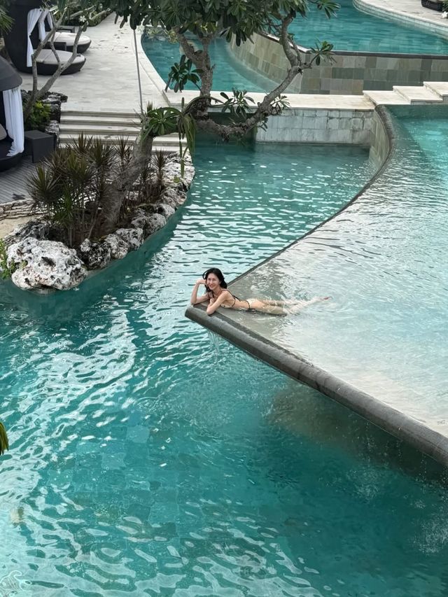 공개된 사진 속 윤혜진은 발리의 한 럭셔리 리조트 수영장에서 비키니 차림으로 여유로운 휴가를 즐기고 있다.