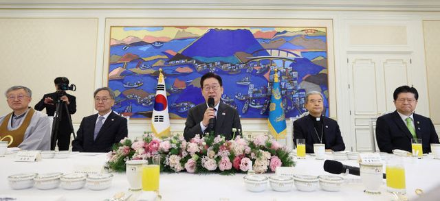 이 대통령은 “우리 사회가 많은 분들이 느끼는 것처럼 갈등과 혐오, 증오가 참으로 많이 늘어난 것 같다”며 “대통령이 해야 할 가장 중요한 일이 국민을 통합하는 것이라 생각하지만, 노력에는 분명 한계가 있다”고 말했다. 이어 “종교의 본질이 사랑의 실천인 만큼, 국민들이 서로 화합하고 포용하는 자세로 함께 살아갈 수 있도록 지금까지 해온 역할을 넘어 앞으로도 더 큰 역할을 해주시길 부탁드린다”고 했다. 그러면서 “오늘 주시는 말씀을 잘 새겨 대한민국이 서로 화합하고 용서하며 포용하는 사회로 나아갈 수 있도록 최선을 다하겠다”고 밝혔다.