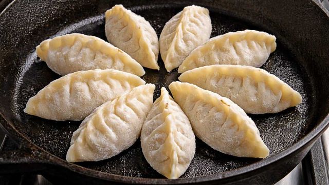 이 과정에서 팬 안에서는 칙칙 소리가 이어진다. 물과 기름, 가루가 만나며 얇은 반죽막이 만들어지는 단계다. 바로 뚜껑을 덮는다. 뜨거울 때 뚜껑을 닫아야 수증기가 위로 올라가 만두 속까지 고르게 익는다. 이 상태로 물이 완전히 사라질 때까지 기다린다. 팬 바닥에서는 반죽이 눌어붙으며 노릇한 색을 만든다.
