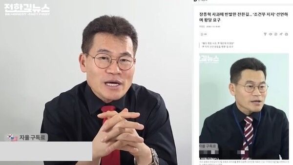 뉴시스 보도에 따르면, 전씨는 지난 9일 자신의 유튜브에서 "장동혁 대표를 지지한다. 하지만 무조건 지지는 아니다"라며 이같이 말했다.