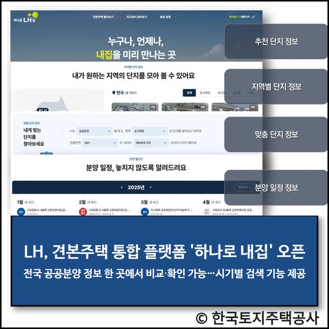 하나로 내집은 전국의 모든 LH 분양단지 정보를 한곳에 모아 제공하는 통합 플랫폼이다. 이는 지역·평형·분양 시기 등 원하는 조건으로 관심 단지를 검색할 수 있다. 또 세대 내부 이미지와 평면도, 주변 인프라 등 주요 정보를 동일 형식으로 제공해 단지 간 비교·분석 편의성을 높였다.