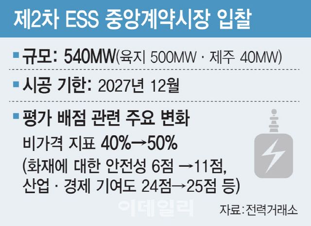 이번 입찰에서는 비(非)가격 평가 비중이 40%에서 50%로 확대됐다. 비가격 평가 항목 중 화재 안전성 평가의 배점(100점 만점)은 6점(1차 입찰)에서 11점으로 높아졌고, 국내 ESS 산업·경제 기여도 배점은 기존 24점에서 25점으로 상승했다.