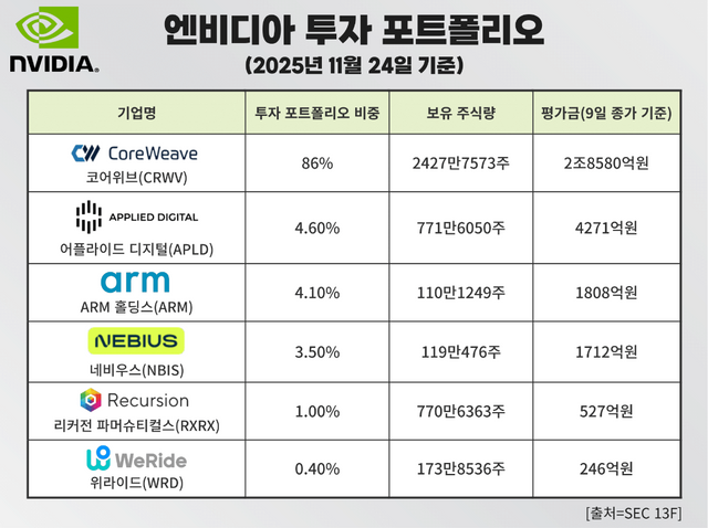 미국 증권거래위원회(SEC) 등에 따르면 엔비디아는 지난해 11월 14일 기준 ▲코어위브(CRWV) ▲어플라이드 디지털(APLD) ▲암 홀딩스(ARM) ▲네비우스(NBIS) ▲리커전 파머슈티컬스(RXRX) ▲위라이드(WRD) 등 6곳의 개별 기업 지분을 소유하고 있다. 모두 엔비디아의 주력 사업인 AI 반도체와 직·간접적으로 연관돼 있는 사업을 영위하는 기업들이다.