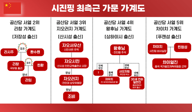 중국 정치권 등에 따르면 현재 중국 공산당의 서열은 ▲시진핑(習近平) 국가주석 ▲리창(李强) 국무원 총리 ▲자오러지(趙樂際) 전국인민대표대회 상무위원장 ▲왕후닝(王滬寧) 전국인민정치협상회의 주석 ▲차이치(蔡奇) 주석 비서실장 등의 순이다. 이들 5인은 중국 정치권을 대표하는 인물이자 최고 권력가들로 평가된다. 그 중에서도 최고 권력자인 시 주석은 부친 시중쉰(習仲勳)과 어머니 치신(齊心) 사이에서 태어났다. 어머니 치신은 시중싄의 둘째 부인이다. 시중쉰은 1930년대부터 공산혁명에 참여해 항일전쟁과 국공내전에서 활동하며 중국 권력 핵심인 국무원 부총리까지 역임한 공산당 혁명 원로다.