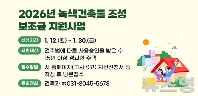 시는 12일 높은 에너지 효율 달성 및 온실가스 배출 저감을 위한 '2026년 녹색건축물 조성 보조금 지원사업'과 안전하고 쾌적한 주거환경 조성을 위한 '2026년 소규모 공동주택 공용시설물 보조금 지원사업'을 추진한다고 밝혔다.