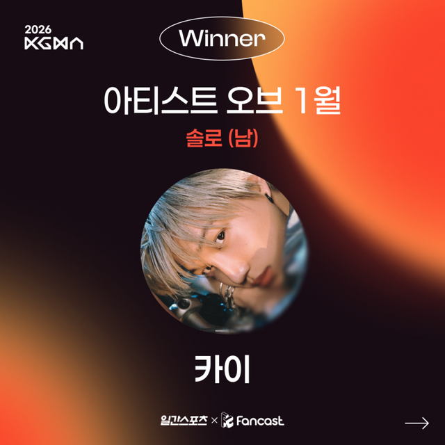 지난 6일부터 11일까지 팬캐스트 앱을 통해 진행된 ‘2026 KGMA 아티스트 오브 먼스’ 1월 솔로 남자 부문 투표에서 카이는 총 1만4411표를 획득해 1위에 차지했다.