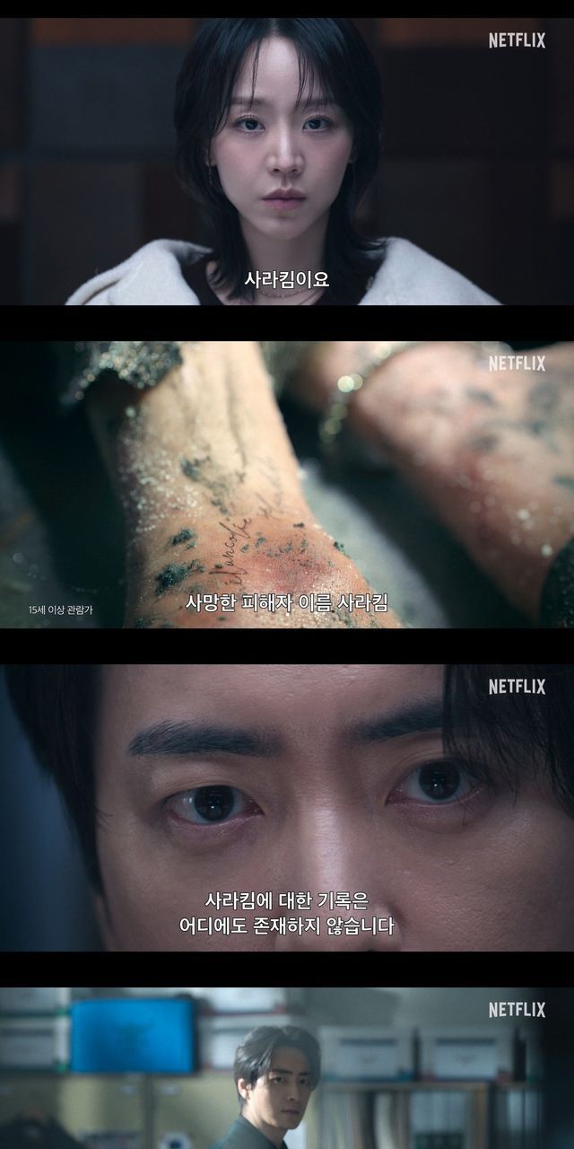 공개된 티저 포스터는 가방으로 얼굴이 가려진 채 피를 흘리고 있는 여성의 시신과 그 옆에 앉아있는 형사 ‘박무경’(이준혁)의 모습으로 단번에 시선을 집중시킨다. 그 뒤로 흐릿하게 보여지는 ‘사라킴’(신혜선)의 실루엣과 빼곡히 쓰여진 노트는 과연 그들에게 무슨 일이 벌어졌을지, 이 사건과 그의 연결고리는 무엇일지 궁금증을 자극한다. 특히 ‘사라킴’의 얼굴선을 따라 흐르는 피가 ‘무경’을 지나 사체까지 이어지는 모습은 그녀가 숨기고 있는 진실과 그 진실을 좇는 ‘무경’의 서사에 대한 기대를 높인다.