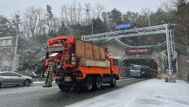 제설차량이 터널 부근을 지나며 제설제를 뿌리고 있다. 기사의 이해를 돕기 위한 사진 / 뉴스1