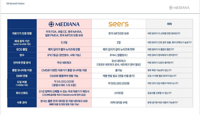 이런 가운데 메디아나는 최근 기업설명회에서 씨어스를 실명으로 언급하며 환자 모니터링 플랫폼과 심전도 솔루션 모두 자사 제품 대비 경쟁력이 떨어진다고 주장했다. 회사는 △실시간 모니터링 최대 동작 기간 △웨어러블 심전도 품질 △방수 성능 △인터넷 연결 방식 △통합 모니터링 지원 여부 △전자의무기록(EMR) 연동 △도입 비용 △회사 신뢰도 △사후관리 측면 전반에서 씨어스가 자사보다 열위에 있다고 강조했다.