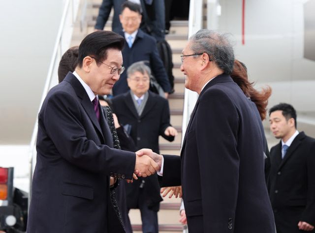 이 대통령 부부는 항공기 트랩 아래 레드카펫에서 일본 측 환영 인사들과 차례로 인사를 나눴다. 이 대통령은 짙은 남색 코트에 보라색 넥타이를 착용했고, 김혜경 여사는 흰색 블라우스에 검은색 코트 차림이었다.