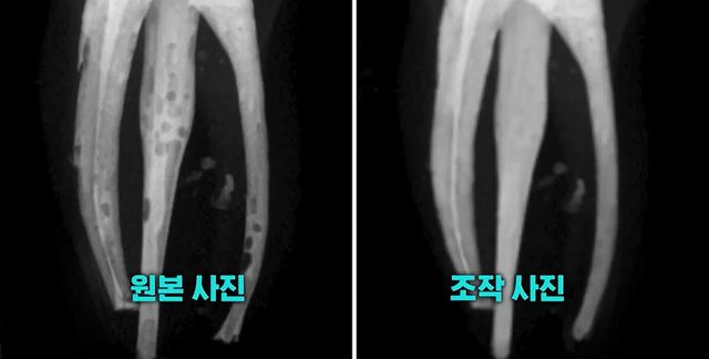 원본 엑스레이 사진에는 신경치료 과정에서 충전재를 꼼꼼히 채워 넣지 않아 기포가 들어찬 모습이 여러 군데 보였다. 그러나 학생들이 교수진에 최종 제출한 사진은 기포 하나 없이 깨끗하게 치료된 모습이었다.