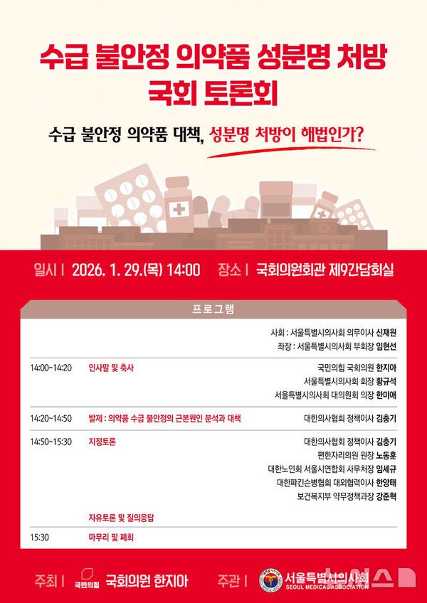 뉴시스 보도에 따르면, 서울특별시의사회는 오는 29일 오후 2시 서울 여의도 국회 의원회관 제9간담회실에서 '수급 불안정 의약품 대책, 성분명 처방이 해법인가'를 주제로 토론회를 개최한다고 13일 밝혔다.