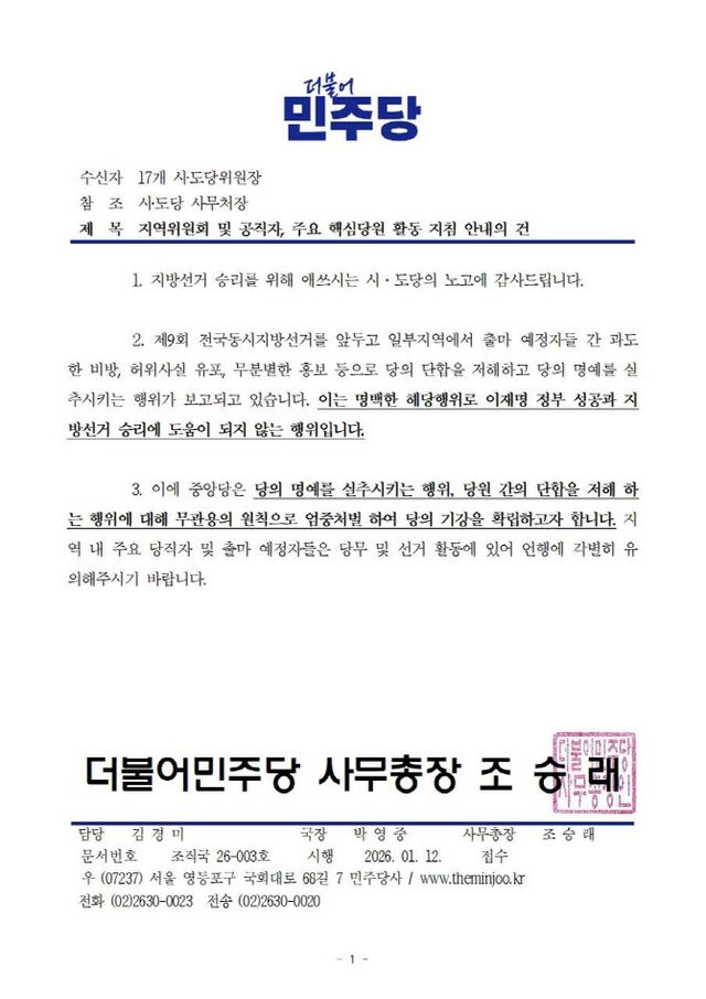 중앙당은 공문에서 “출마 예정자 간 과도한 비방과 허위사실 유포는 당의 단합을 저해하고 당의 명예를 실추시키는 행위”라며 “이재명 정부의 성공과 지방선거 승리에 전혀 도움이 되지 않는다”고 밝혔다.