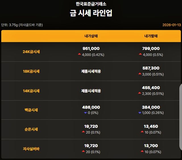 국내 금시세(금값)가 13일(한국 시각) 오후 상승세(전 거래일 대비)를 보이고 있다.