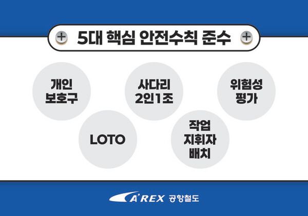 공항철도는 올해 ▲작업 시 5대 핵심안전수칙 준수 ▲위험성 평가 생활화 ▲근로자 건강증진 활동 전개 등 주요 과제를 설정하고, 이를 중점적으로 추진할 계획이다.