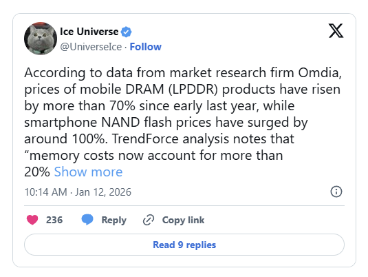 시장조사기관 Omdia 분석(팁스터 아이스 유니버스 공유)에 따르면, 스마트폰 제조사들은 현재 모바일 LPDDR DRAM에 최대 70% 프리미엄, 낸드 플래시에 최대 100% 프리미엄을 지불하고 있다. 메모리 가격 급등이 단기간에 해소될 가능성은 낮다는 평가다.