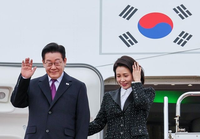 일본 순방 일정에 나선 이재명 대통령과 김혜경 여사가 13일 오사카 간사이 국제공항에서 환영객들에게 인사를 하고 있다. / 뉴스1
