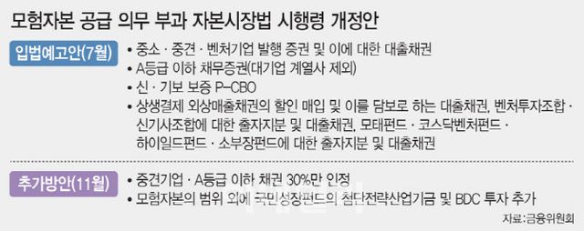 지난해 11월 발표된 모험자본의 범위에는 당초 입법예고한 △중소·중견·벤처기업 발행 증권 및 대출채권 △A등급 이하 채무증권(대기업 계열사 제외) △신·기보 보증 P-CBO △벤처투자조합 출자지분 △각종 정책펀드 출자지분 등과 함께 국민성장펀드의 기금 발행 채권 및 기금 출자 펀드, BDC(기업성장집합투자기구) 투자가 추가됐다.