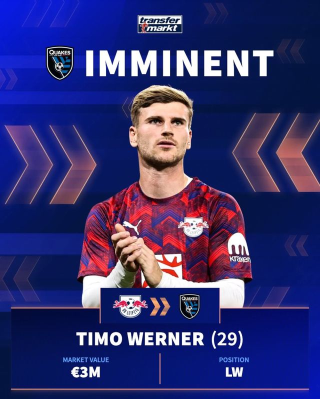 글로벌 스포츠 매체 ESPN은 13일(한국시간) 소식통의 보도를 인용, “공격수 베르너가 미국 메이저리그사커(MLS) 새너제이 어스퀘이크스 이적에 근접했다”며 “협상이 완전히 마무리된 건 아니지만, 소식통은 베르너가 새너제이에 합류할 가능성이 크다고 전했다”고 밝혔다.