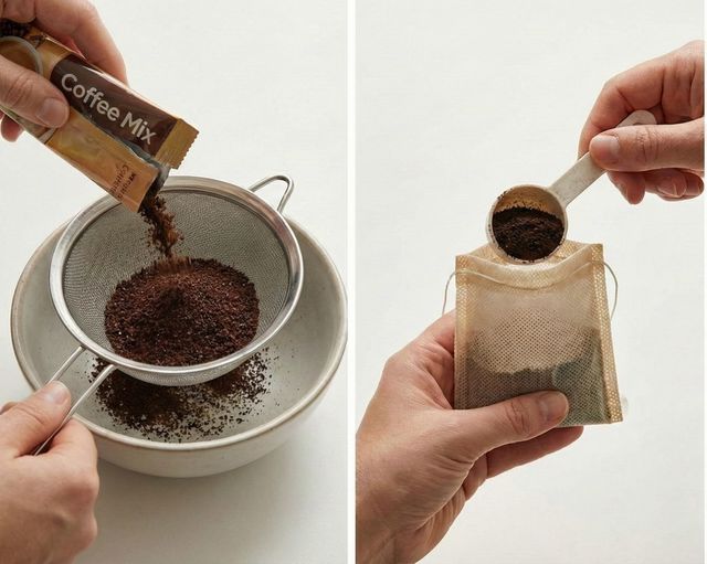 가장 간단한 활용법은 '탈취제'다. 다시백처럼 공기가 통하는 주머니가 있다면 별다른 준비 없이 만들 수 있다. 이때, 커피믹스를 바로 쓰기보다는 채반에 한 번 걸러 커피가루만 분리하는 작업이 필요하다. 블랙커피는 그대로 사용해도 되지만, 커피믹스에는 설탕과 프림이 들어 있어 커피가루만 꼭 걸러내주는 것이 좋다.