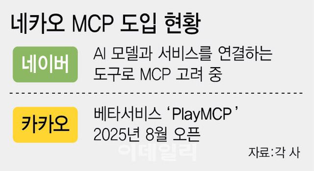네이버(NAVER(035420))는 자사 AI 에이전트 서비스가 본격화된 이후 MCP 또는 MCP와 호환되는 구글의 유니버설 커머스 프로토콜(UCP)과의 연동을 모색할 수 있다는 입장이다. 네이버는 에이전트 서비스를 개발 중이며, MCP 역시 AI 모델과 서비스를 연결하는 여러 시스템 중 하나로 검토하고 있는 것으로 전해진다.