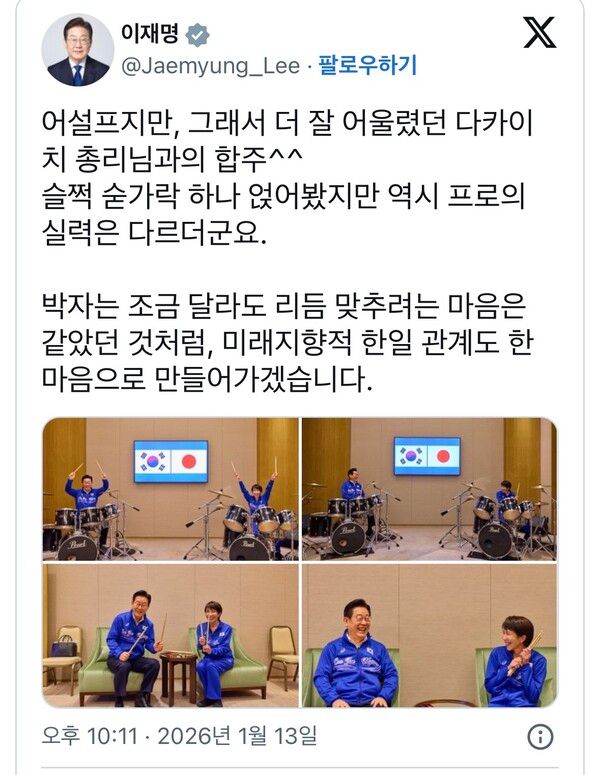 같은 시각 이재명 대통령의 행보 또한 집중이 되었다. 선물한 드럼으로 다카이치와 드럼 합주중이라 화제가 되는 중이다.