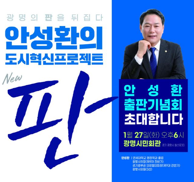 안성환 시의원은 1963년 전북 고창 출생으로 연세대학교 행정학과를 졸업했다. 12년에 걸친 의정활동 중 광명시의회 의장과 경기중부권 의장협의회장을 역임했다.
