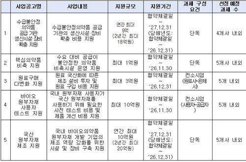 이 사업은 원부자재 개발 기업의 제조 역량 강화를 위해 시설과 장비 구축을 지원하며 바이오의약품 원부자재 공급망도 강화할 예정이다.