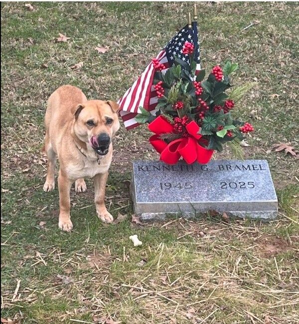 사진 속 개 옆에 있는 묘비에는 '케네스 브래멀 1945–2025'이라고 적혀 있다.