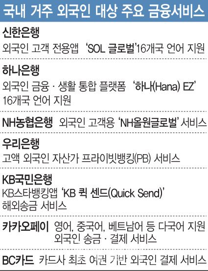 13일 금융권에 따르면 은행과 카드·페이사 등은 국내 거주 외국인 공략을 위해 △외국인 고객 전용앱 △외국인 자산관리 전담채널 △다국어 지원 해외 송금·결제 서비스 △생성형 AI 기반 외국인 상담 서비스 등을 제공하고 있다. 시중은행의 외국인 고객 전용앱은 계좌계설, 환전, 대출 등은 물론, 한국 생활정보까지 다국어 지원하는 외국인 맞춤형 플랫폼으로 진화하고 있다.