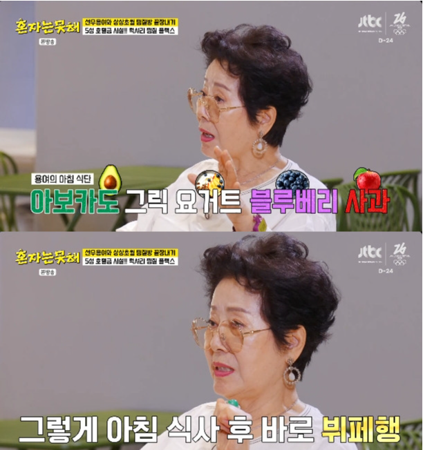 이어 이수지가 “가장 좋아하는 음식이 어떤 거냐”고 묻자 선우용여는 “이제 좋아하는 음식을 따지고 싶진 않고, 내 몸에 좋은 것이 최고다”라고 답했다. 선우용여는 “아침에 아보카도 좀 먹고, 그릭 요거트, 블루베리, 사과를 먹는다. 그렇게 아침 식사를 하고 바로 뷔페에 간다”고 밝혀 멤버들을 놀라게 했다.