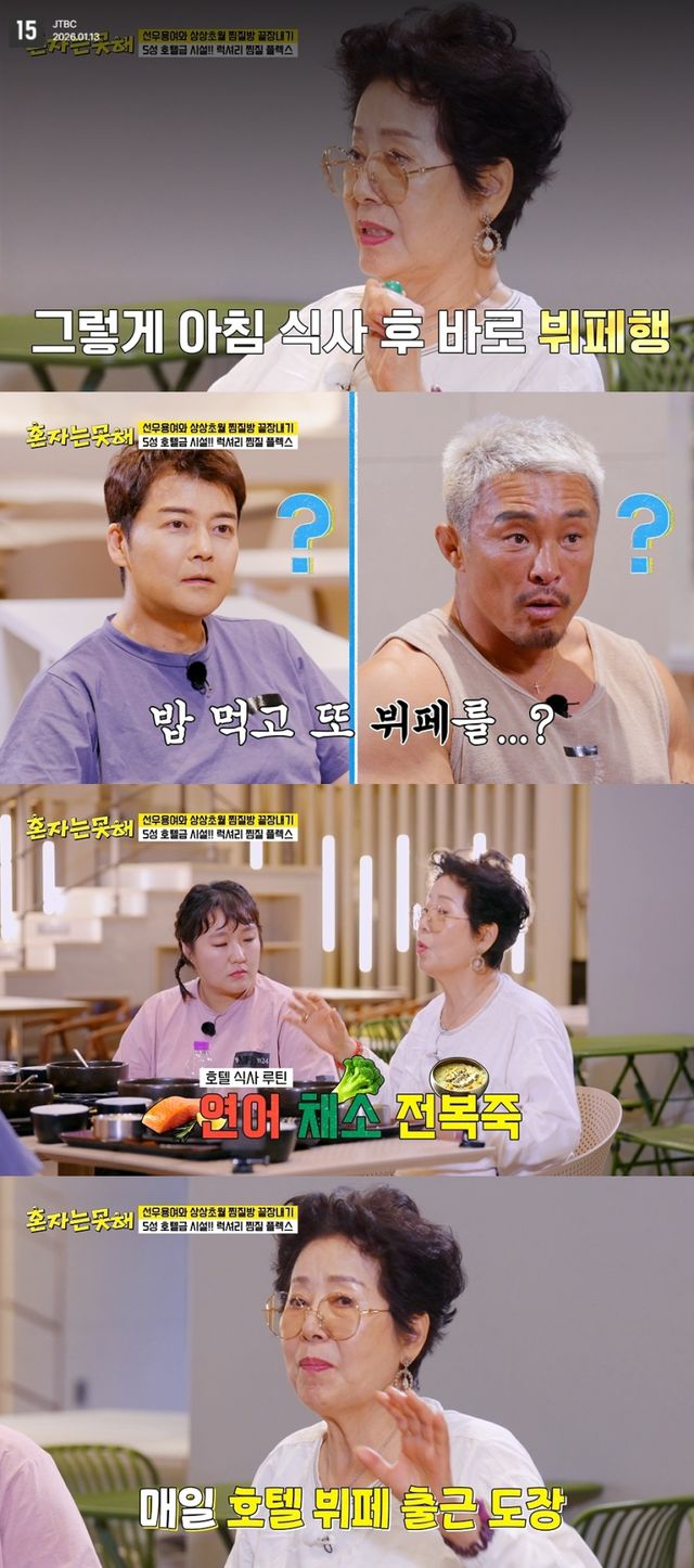 지난 13일 첫 방송된 JTBC 예능 ‘혼자는 못 해’에서는 첫 게스트 선우용여가 전현무, 추성훈, 이수지, 이세희와 함께 럭셔리 찜질방 투어에 나서는 모습이 그려졌다. 5성급 호텔을 연상케 하는 찜질방에서 휴식을 마친 이들은 식당으로 이동해 식사를 이어갔다.