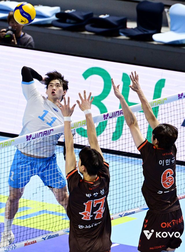 대한항공은 13일 인천 계양체육관에서 열린 진에어 2025~26 V리그 남자부 OK저축은행과의 홈 경기에서 세트 스코어 2-3(25-21, 20-25, 25-20, 28-30, 13-15)으로 역전패를 당했다.