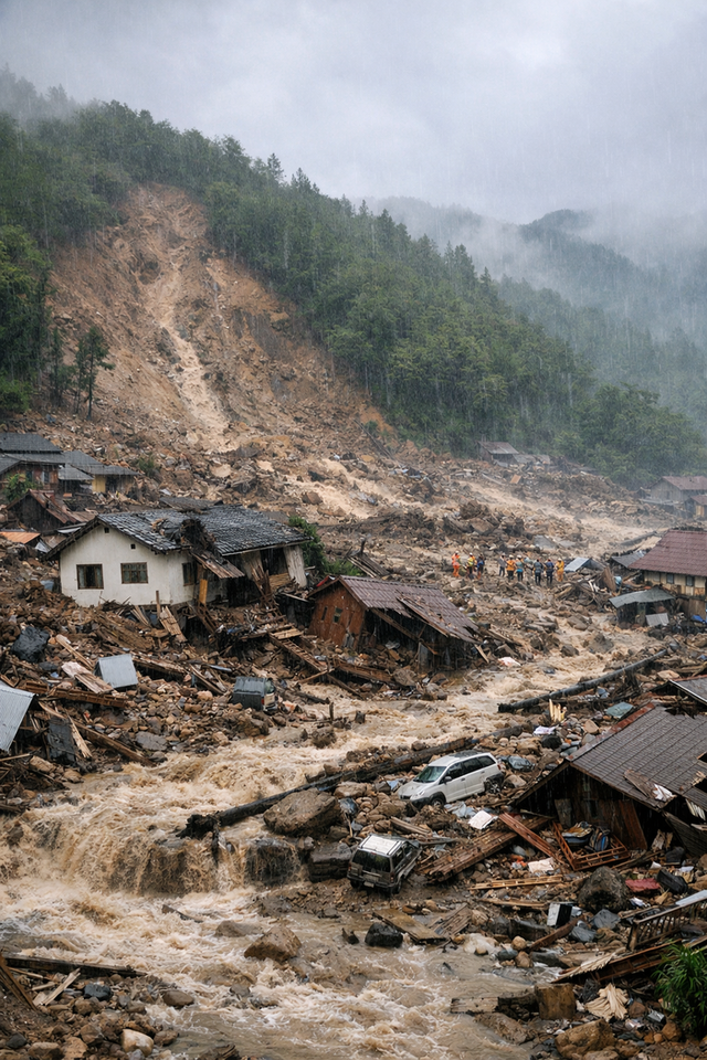 ▲ 폭우로 무너진 산사태 현장과 매몰된 마을