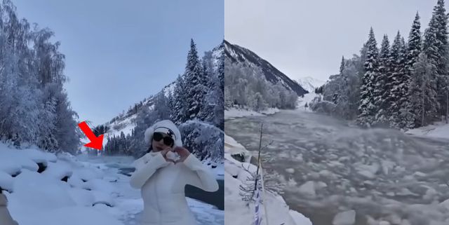 영상에는 아름다운 설경 속에 포즈를 취하던 관광객들 뒤에서 잔잔하던 강물이 갑자기 얼음덩어리와 함께 순식간에 불어나는 모습이 담겨있다.