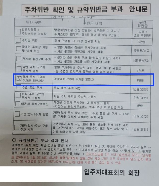 논란의 중심은 경차 주차 규정이다. 안내문에는 일반 주차 구역에 주차한 경차와 경차 전용 구역에 주차한 일반 차량 모두에게 1만 원의 위반금을 부과한다는 내용이 담겼다. 일부 안내문에는 경고 누적 후 벌금이 부과된다는 설명도 포함됐다.