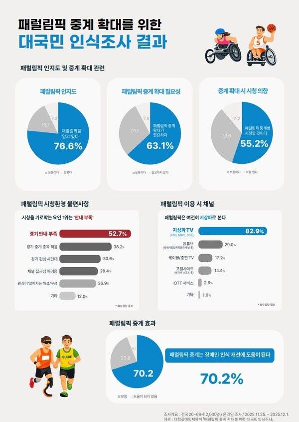 조사 결과 국민 10명 중 7명(76.6%)이 패럴림픽을 인지하고 있는 것으로 나타났으며, 63.1%가 패럴림픽 중계 확대가 필요하다는 응답을 내놨다.