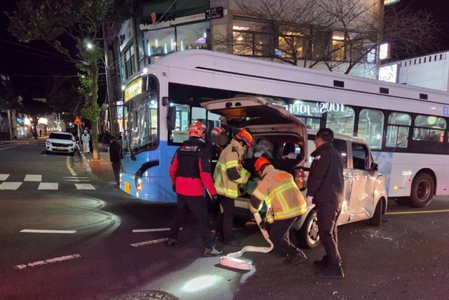 14일 제주소방안전본부에 따르면 전날 오후 6시 18분쯤 서귀포시 중문동의 한 도로에서 경차가 버스 2대를 들이받았다는 신고가 접수됐다.