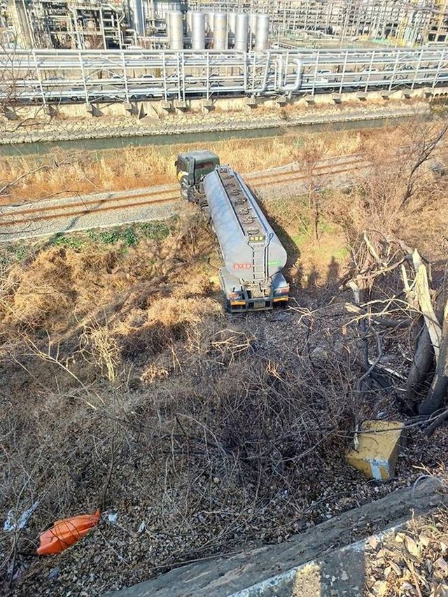 신호등이 없는 교차로를 직진하던 탱크로리 차량이 좌회전하던 승용차와 충돌하면서 균형을 잃었고, 충격을 받은 탱크로리는 도로를 이탈해 약 5m 아래 철로로 곤두박질쳤다.