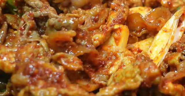 팬에 고기를 올릴 때 식용유 대신 들기름을 소량 먼저 두른다. 이때부터 고기에서 고소한 향이 올라오기 시작한다. 고기를 완전히 볶기 전, 겉면이 익어갈 때쯤 양파와 양배추 같은 채소를 넣어 함께 볶는다. 채소에서 나오는 수분이 고기를 부드럽게 만들어주고, 들기름 향이 자연스럽게 스며든다.