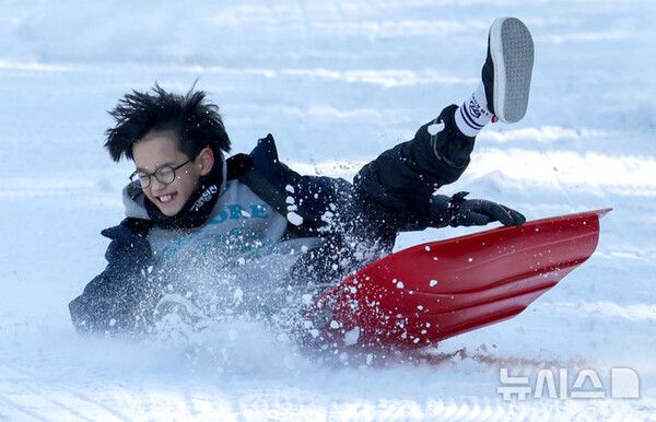 [서울=뉴시스] 14일 대구 달서구 이월드 눈썰매장에서 한 아이가 눈썰매를 타며 즐거운 시간을 보내고 있다.
