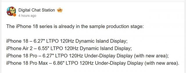아이폰 18 시리즈의 디스플레이 크기와 개발 단계에 대한 루머가 나왔다. 중국 웨이보 팁스터 디지털 챗 스테이션은 아이폰 18 라인업이 현재 프로토타입 생산 단계에 들어갔다고 주장했으며, 특히 프로 모델에서 언더디스플레이 Face ID를 테스트 중이라고 언급했다.