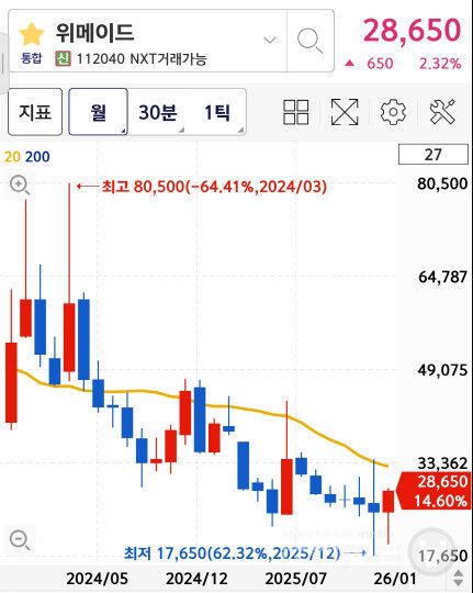 위메이드는 2024년 3월 고점인 80,500원을 기록한 이후 2025년 내내 장기적인 하향 곡선을 그리며 침체기를 겪었다. 특히 실적 면에서 상반기 영업손실과 당기순손실이 지속되면서 주가에 큰 하방 압력을 가했다. 이로 인해 2025년 12월에는 3년 내 최저 수준인 17,650원까지 떨어지며 바닥을 확인하기도 했습. 하지만 3분기 중국 라이선스 매출이 반영되어 흑자 전환에 성공하면서 10월부터 점진적인 반등 기회를 모색했다. 2026년 1월 현재 주가는 최저점 대비 약 62% 회복한 28,650원 선에서 거래되며 하락세를 멈추고 횡보하는 모습을 보이고 있다.