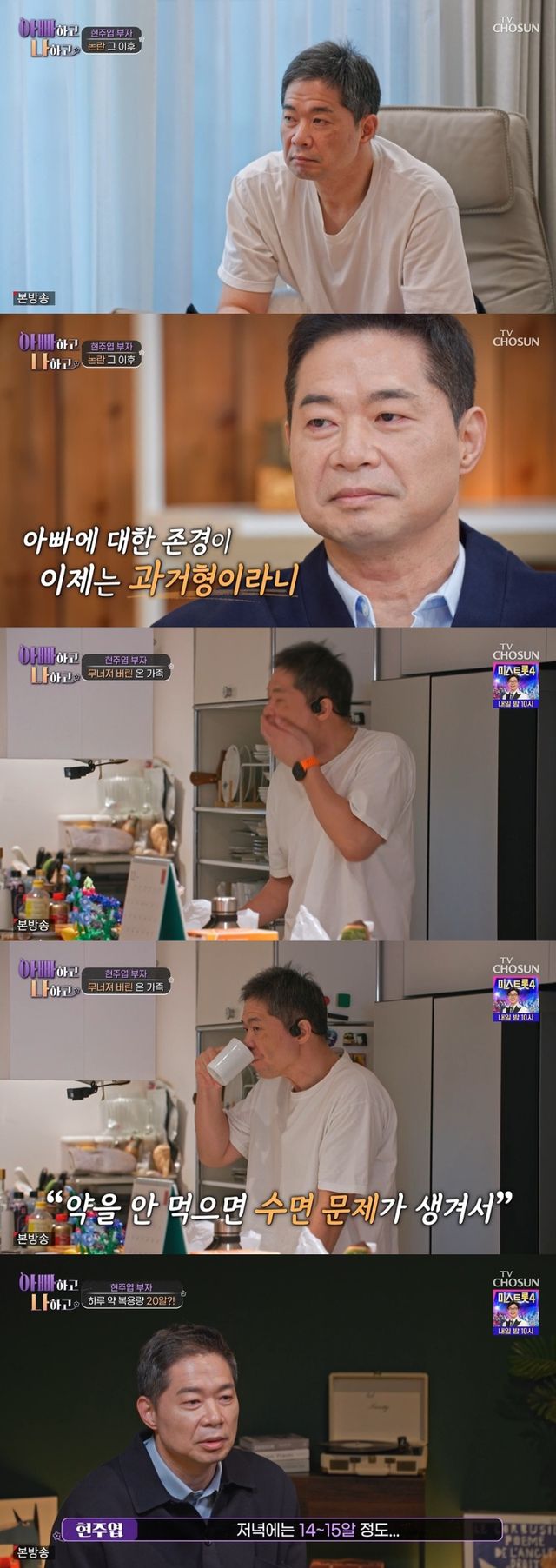 건강 상태 역시 심각한 수준이었다. 현주엽은 수면 장애와 불안 증세를 겪고 있다며 “약을 먹지 않으면 잠을 잘 수 없는 상태”라고 말했다. 그는 “아침에는 각성 관련 약을 6알 정도 먹고, 저녁에는 안정제와 수면제를 포함해 14~15알을 복용하고 있다”며 1년 반 가까이 정신과 처방약에 의존하고 있다고 고백했다. 이어 “지금은 온 가족이 약을 먹고 있는 상황”이라며 씁쓸함을 드러냈다.