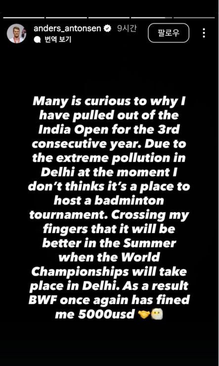 보도에 따르면 안톤센은 자신의 인스타그램 스토리를 통해 발표한 성명문에서 "많은 사람들이 내가 왜 인도 오픈을 3년 연속으로 빠졌는지 궁금해한다. 현재 뉴델리의 극심한 대기오염 때문에 배드민턴 대회를 개최할 장소로 적합하지 않다고 생각한다"고 밝혔다.
