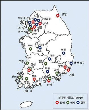 입지분야에는 경남 고성·남해·함양, 전남 신안·영암·장성, 전북 고창 등 영호남지역의 기초지자체가 다수 포함됐다. 행정편의성 부문에서는 경기 남양주·안산, 경남 거창·하동, 경북 영천, 대전 대덕, 울산 북구, 서울 노원구·성동구·중구가 톱10에 이름을 올렸다.