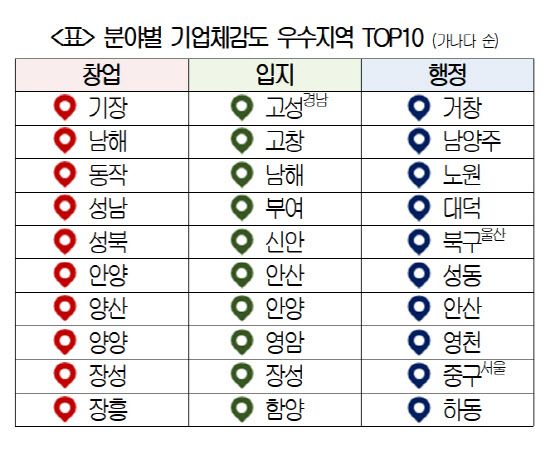 이번 조사는 기업활동 과정에서 기초지자체 행정을 경험한 기업이 느끼는 주관적인 만족도를 조사해 분야별 상위 기초지자체 10곳을 선정한 것이다. 창업 우수지역은 경기 성남·안양, 서울 동작구·성북구 등 수도권 기초지자체를 비롯해 강원 양양, 경남 남해·양산, 부산 기장, 전남 장성·장흥이 꼽혔다.