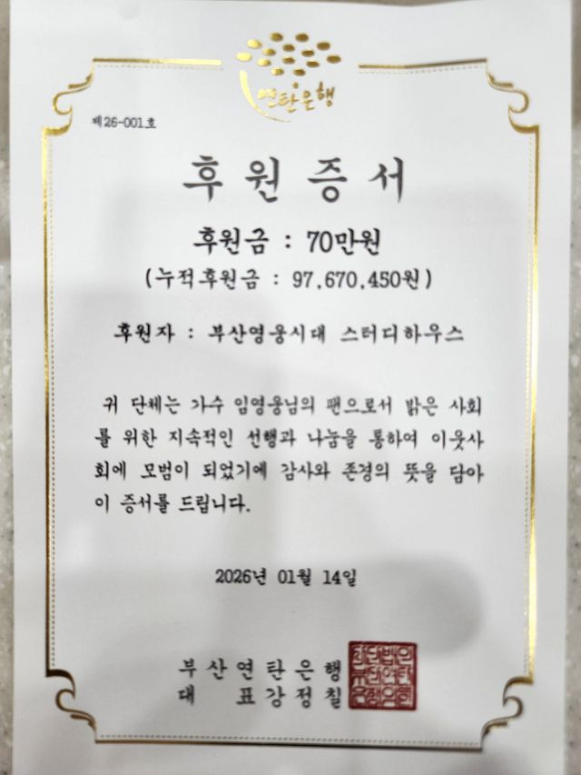 임영웅의 팬클럽으로 잘 알려진 부산영웅시대 스터디하우스는 ‘혼자가 아닌 같이의 힘으로’라는 슬로건 아래, 팬 활동을 넘어 지역 사회와 함께하는 실천을 중요하게 여겨왔다. 스터디하우스 측은 “앞으로도 독거 노인들을 위해 지속적인 후원과 봉사를 이어가며 임영웅의 선한 영향력을 널리 퍼뜨리겠다”고 밝혔다.