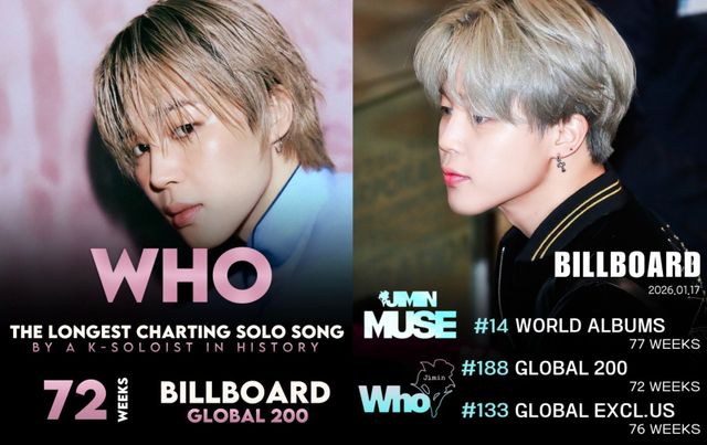 방탄소년단(BTS) 지민은 미국 음악 전문 매체 빌보드가 발표한 최신 차트에서 솔로 2집 ‘MUSE’의 타이틀곡 ‘Who’로 또 하나의 이정표를 세웠다. ‘Who’는 빌보드 ‘글로벌 200’ 차트에 188위로 재진입하며 총 72주 차트인에 성공했다. 이 곡은 앞서 해당 차트에서 두 차례 1위를 기록한 바 있으며, 72주 진입은 K팝 솔로곡 가운데 최초이자 유일한 기록이다.