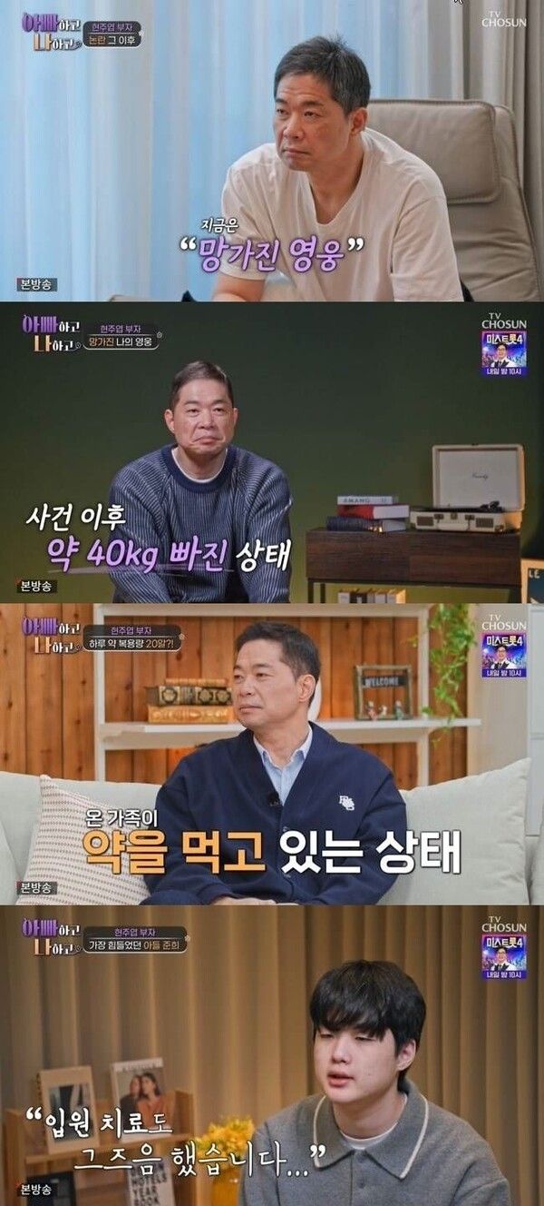 현주엽은 첫째 아들 준희 약도 챙겼다. "지금 온 가족이 약을 먹고 있다. 혼자 겪는 일이었다면 괜찮았을텐데, 아이들과 아내까지 힘든 시간을 보내 가장 괴로웠다"며 "준희가 (정신)병원에 있는 시간이 가장 길었고, 그때부터 말을 거의 하지 않는다. 말을 걸기도 부담스러울 정도로 마음의 문을 닫았다"고 설명했다.